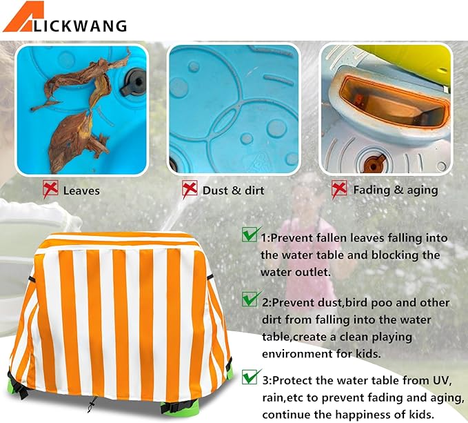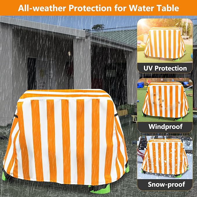 - Weatherproof and full protection--Our kids water table cover is made of heavy duty waterproof polyester,double needle stitching for seams,which is stury and durable.It can provide full protection for your kids water play table, protect kids water table from UV,rain,dust,leaves,bird droppings and etc to keep it dry and clean.