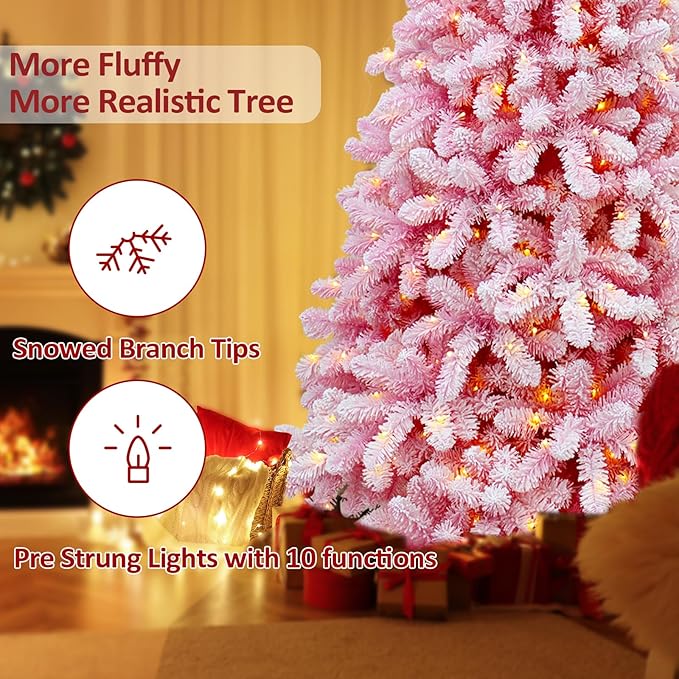 - Gorgeous Pink Design: Pink color adorned with delicate flocking, the Christmas tree exudes elegance and charm. The soft, velvety texture of the flocking creates a winter wonderland ambiance, reminiscent of freshly fallen snow, adds a touch of winter magic to your holiday decor