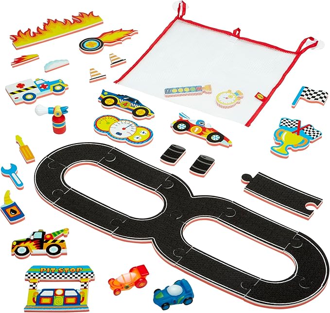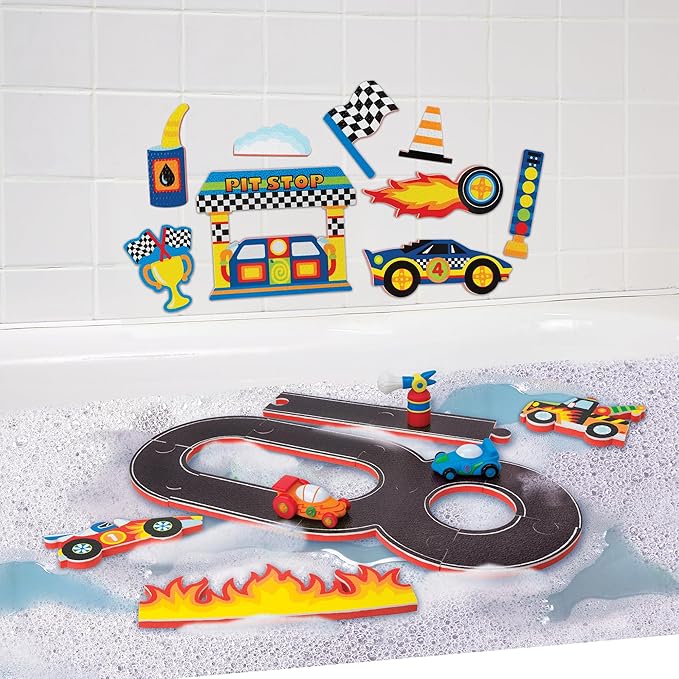 - FULLL BATH SET: Includes 32 colorful floating foam pieces including racetrack and arena scene, 2 squirter race cars, squirter fire extinguisher and suction cup mesh storage bag.