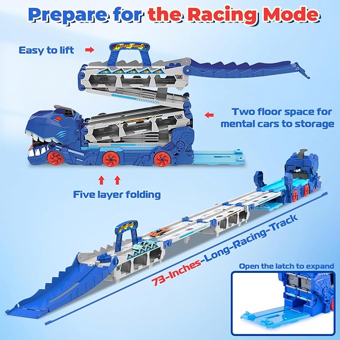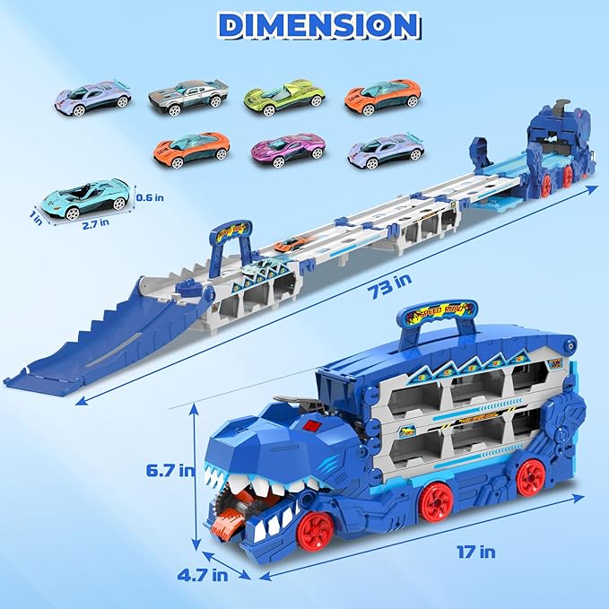 - 【3-in-1 Transport Truck Toys】: Zoom into high-speed fun with our foldable track carrier truck set! This playful transport truck toy can swallow cars, storage car and also transforms into a 6-ft race track with a dual launcher and 8 metal cars for competitive racing. It's ready for any race challenge! Come and have a tense and exciting racing competition with your friends!