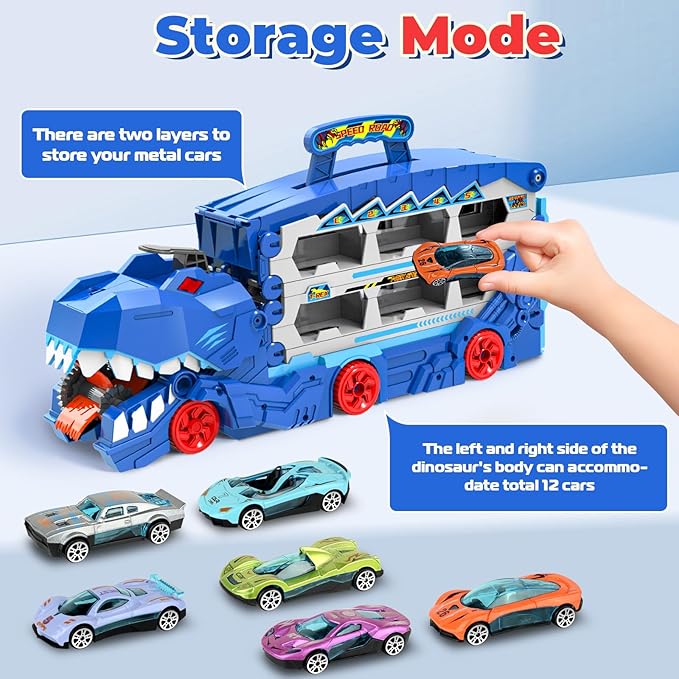 - 【Large Capacity Toy Storage Transporter】: This dinosaur truck can not only be used as a push-pull transport vehicle but also as a storage space for small cars. The Dino transporter can store up to 12 metal toy cars. Capable of holding 6 cars on each side. The ample parking space helping to develop your child's Storage skills. Made from top-notch, safe materials, with popular colors and eye-catching design, this is sure to delight any little car enthusiast.