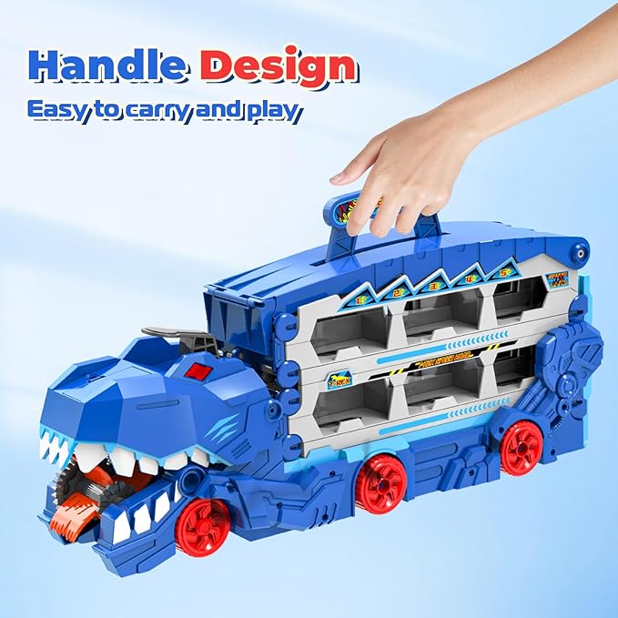 - 【Gift for Dinosaur Lovers】: Ignite kids love for racing with our track carrier truck set. The car track truck toys are great for toddlers boys girls who love dinosaurs and toy trucks. This stable and safe wheels truck with dinosaur head and race cars encourages imaginative play, creativity, and helps improve hand-eye coordination skills. Gifts for kids boys girls 3 4 5 6 7 8 year old birthday party or other holiday favors.
