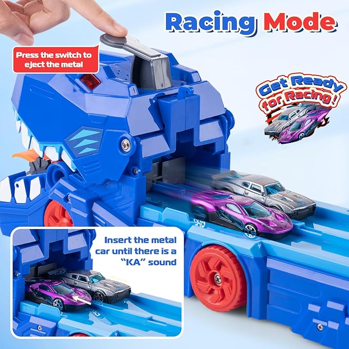 - 【Dinosaur with 6-FT Race Dual Track】: A secure latch in the back opens and lift the body of the Dinosaur devouring car(no assembly) to create a 6-ft (73 inch) dual racetrack, which is great for 1 or 2 players to race. Insert the metal car until there is a “KA” sound, then press a button and the launcher will automatically push the metal cars onto the track. Compete with your partner to see whose car is faster, enjoy the fun of racing!