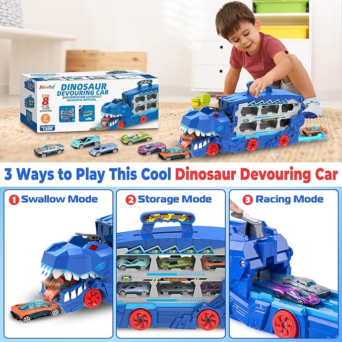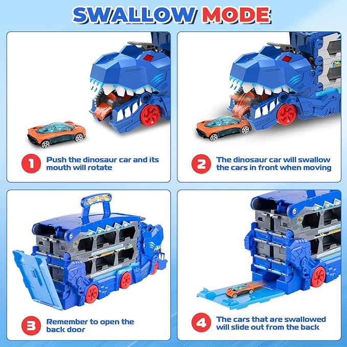 - 【Swallow Metal Cars】: This dinosaur truck toy set comes with 8 metal cars (random style), Pushed the dinosaur truck toy forward and it will swallow the metal cars on the way. The cars can slide out from the open tailgate to simulate car escape action scenes, providing excitement and fun for children, add more fun to play. Top handle design, easy to carry and store.