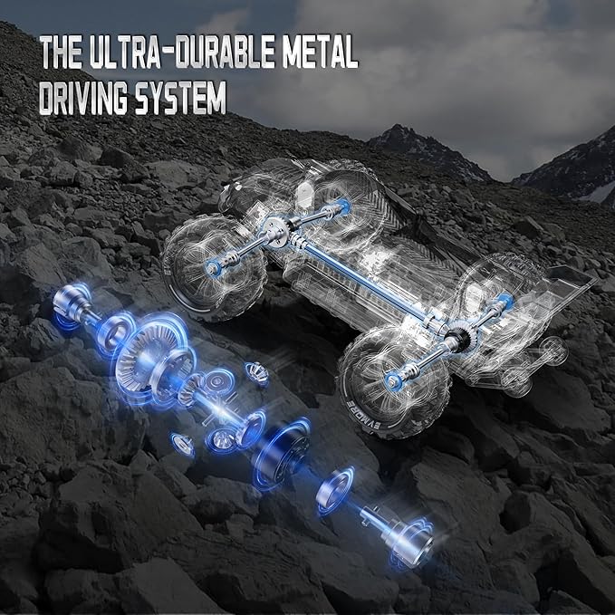- Durable and Efficient Transmission: Metal gears and metal differential better distribute power to achieve a perfect 4WD, in which the 5.5MM diameter axle and M4 nuts contributed. The smooth effect of 16 ball bearings reduces power loss, make this car power smoothly