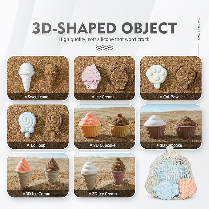 - Package include: Each set contains one of the following: one Bucket, one Watering Can, one Shovel, one Spoon, four Sand Molds, two 3D Ice cream, two 3D Cupcake, one Beach Bag