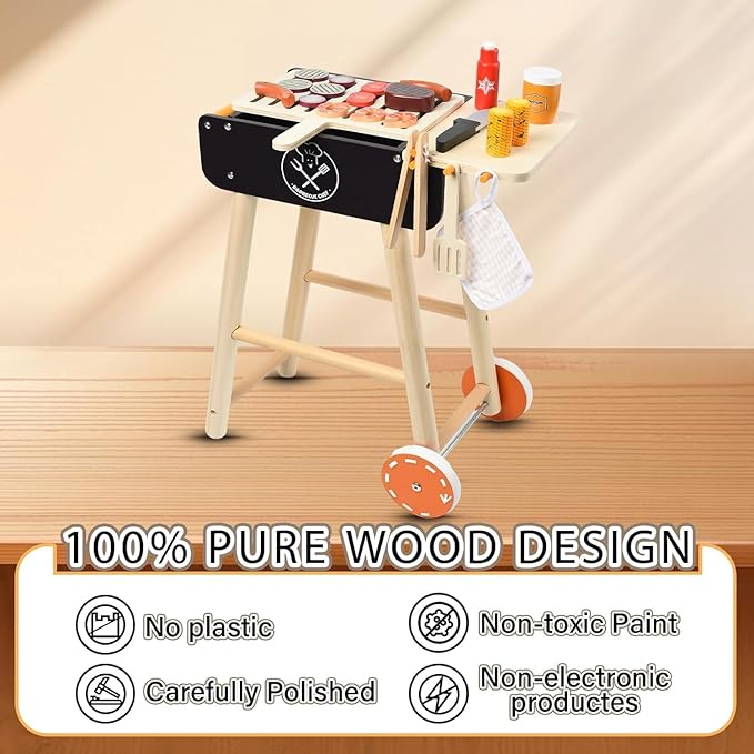 - Safe and Durable Design: Made from high-quality wood, this toy grill is designed for safety and durability. It’s the perfect play food set for toddlers aged 3-6, ensuring hours of fun without compromising on quality