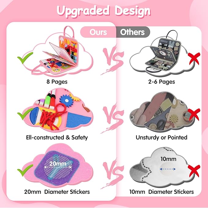 - 【Safe and Durable Toddler Toys】Montessori busy boards are crafted with safety and durability in focus. We use high-quality, soft, and resilient felt that is non-toxic and meets safety standards. The sturdy binding makes this toddler girl toy highly durable and prevents any parts from easily falling off, even during enthusiastic play sessions. Wish you and your toddler a happy time while playing with this busy board book.