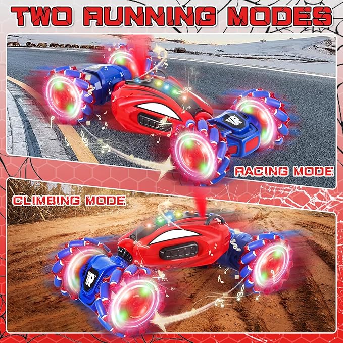 - Super Cool S-pider Dual-Control RC Stunt Car: NEUBSAW new upgraded s-pider RC car has 2 control modes - 2.4GHz remote control and gesture sensing controller in all directions, which is sensitive to control and long distance control. It could move forward/back, walking sideways, drift 360° rotation, on/off-road, 4WD double sided or silent driving. One key to turn on/off cool music, spray and dazzling lights and automatic demo function. Definitely a cool toy!