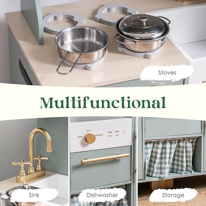 - Stylish Aesthetics;Our play kitchen's soft green color and gleaming gold faucet add a touch of elegance and modernity, making it a stylish addition to any playroom or nursery. The visually appealing design encourages children to engage more deeply with their imaginative play.