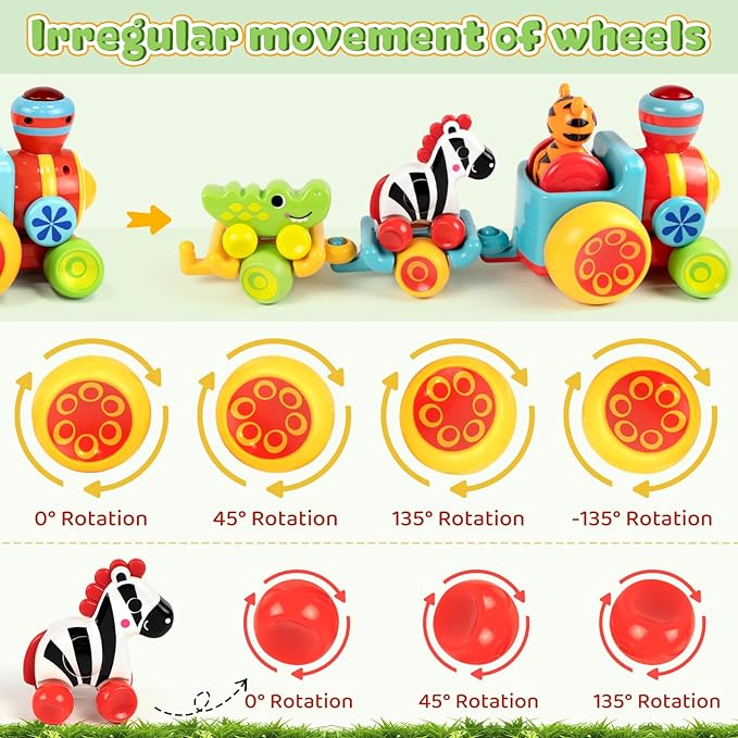 - 【Preschool Learning Toys 】Toddler can push and pull this baby toy for 18-24 months or use string to pull it around to learn cause and effect. Meanwhile, they can play these push-and-go toy cars individually to exercise hand-eye coordination and stimulate curiosity and cognitive development. Children also can recognize the forest animals from these cute eye-catching cartoon cars. This Montessori train toy set is great educational resource for 1 2 3 4 yr old boys and girls.