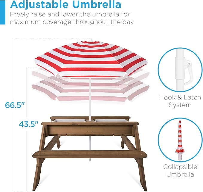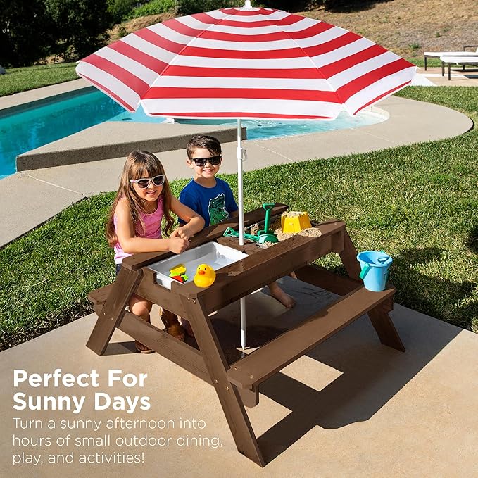 Best Choice Products Kids 3-in-1 Sand & Water Table, Wood Outdoor Convertible Picnic Table w/Umbrella, 2 Trays, Removable Top, 220lb Capacity Per Bench -Walnut/Red