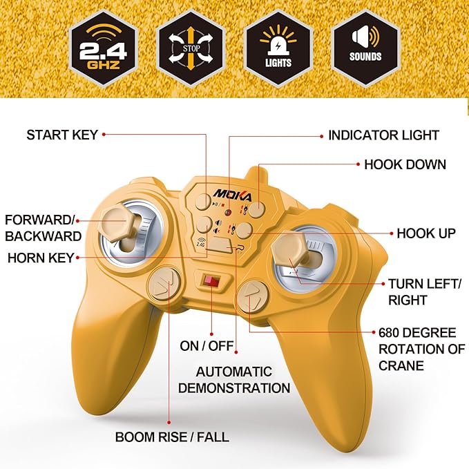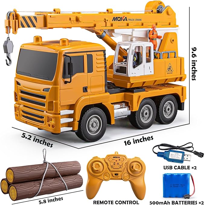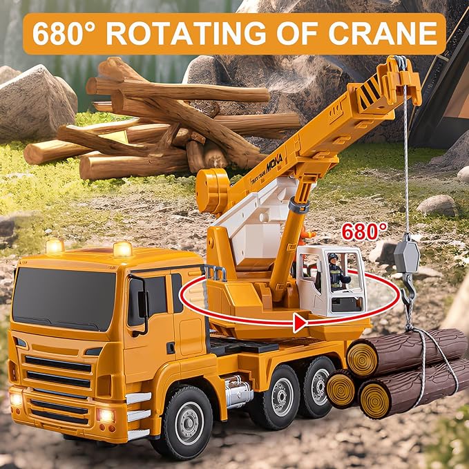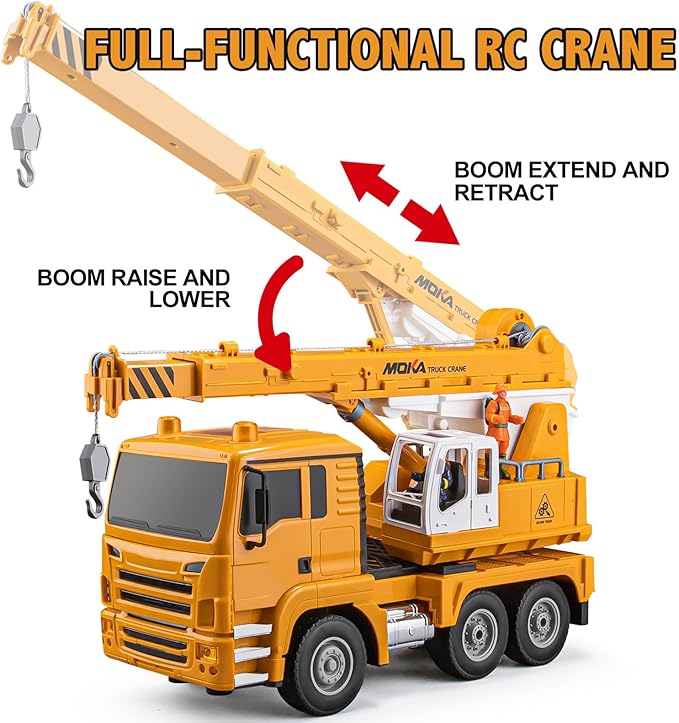 - 13 Channel Full Functional: Simulated RC crane truck, like the real thing. Go forward/backward, turn left/right, head lights and roof lights, 680 degrees rotation of crane, boom raise/extend and lower/retract, hook up and down, auto demonstration.