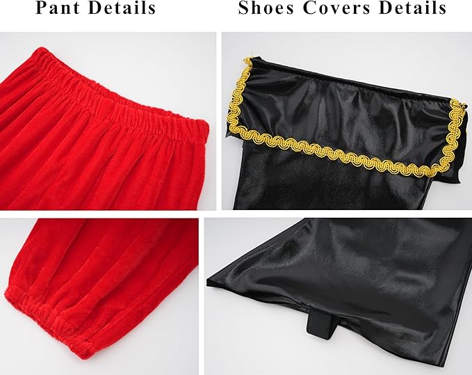 - 14 Pieces Pirate Costume Set: 1xWhite tank top, 1xRed Pants, 1xShoes covers, 1xCoat, 1xBelt, 1xPirate hat, 1xPirate eye patch, 1xPirate necklace, 1xPirate compass, 1xPirate cutlass, 1xPirate sword, 1xCoin bag with 6 coins, 1xPirate map, 1xPirate telescope