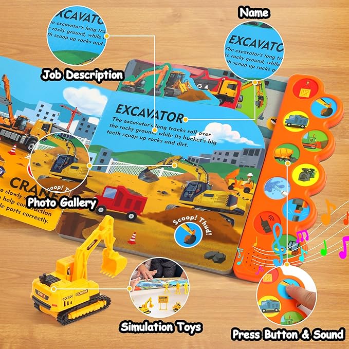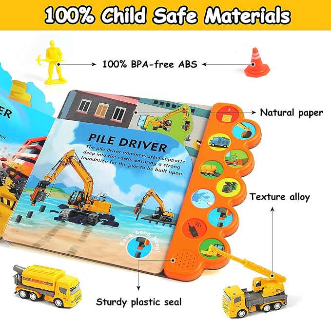 - Durable Materials: Kids board books are made of high quality paper, smooth surface and edges to ensure the safety of children's use, enough thickness and ABS cover make the book more thick and not easy to damage, suitable for long-term use. Toy construction trucks made of alloy, safe and non-toxic, not easy to break, more texture. Suitable size and weight for carrying or storing on the go.Includes an on/off switch on the back cover to extend battery life