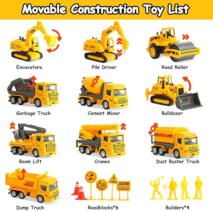 - Value Pack:Toy cars includes a forklift truck, pile driver, crane, aerial work truck, dust collector, lorry, rubbish truck, cement mixer, excavator, road roller, and 10 construction accessories, each with movable joints to push and go. Multiple parts and interactive elements allow little construction lovers to have fun with the visual, auditory, tactile and other senses
