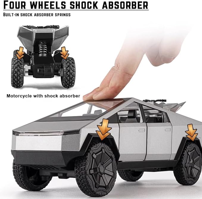 - Includes a metal pickup truck and a four-wheel off-road motorcycle. The motorcycle can be detached and operated independently.