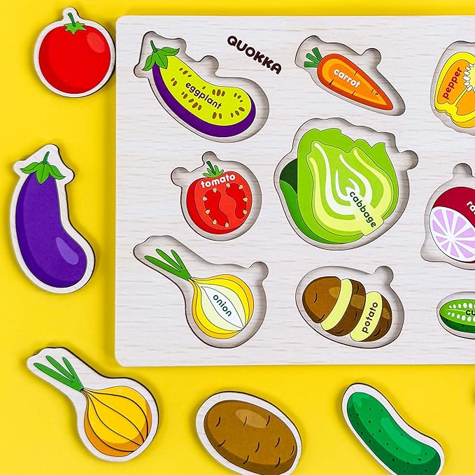 - MY FIRST VEGGIES KIDS PUZZLES: Crafted from high-quality wood with smooth edges and water-based paint; these Montessori-inspired toys are designed to engage and educate toddlers about veggies; each piece has an image behind it