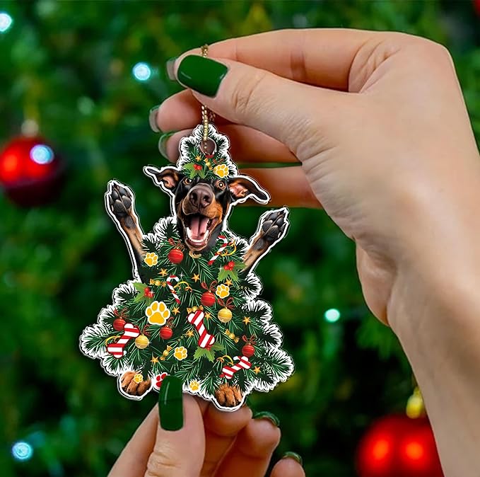 - Charming Doberman Design: This ornament features a playful Doberman Pinscher dressed as a Christmas tree, adorned with festive decorations like candy canes, baubles, and paw prints, adding a unique and joyful touch to your holiday decor.
