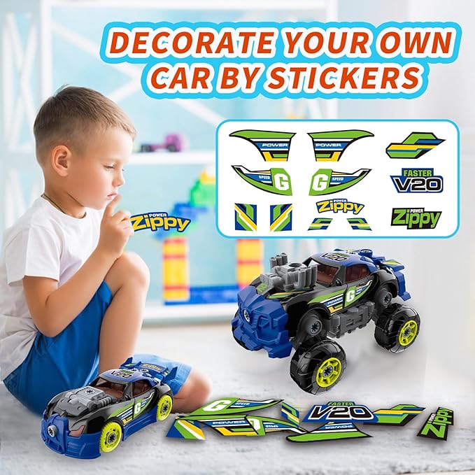 - [Colorful and Fun Decal Stickers]: Bring the vehicles to life with a set of fun decal stickers. These vibrant stickers make the assembly process more engaging and allowing kids to feel like they are creating their very own custom cars.
