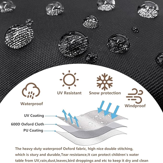 - Weatherproof and full protection:Our kids water table cover is made of heavy-duty waterproof 600D Oxford fabric,double needle stitching for seams,which is stury and durable.It can provide full protection for your kids water play table.It can protect children's water table from UV,rain,dust,leaves,bird droppings and etc to keep it dry and clean