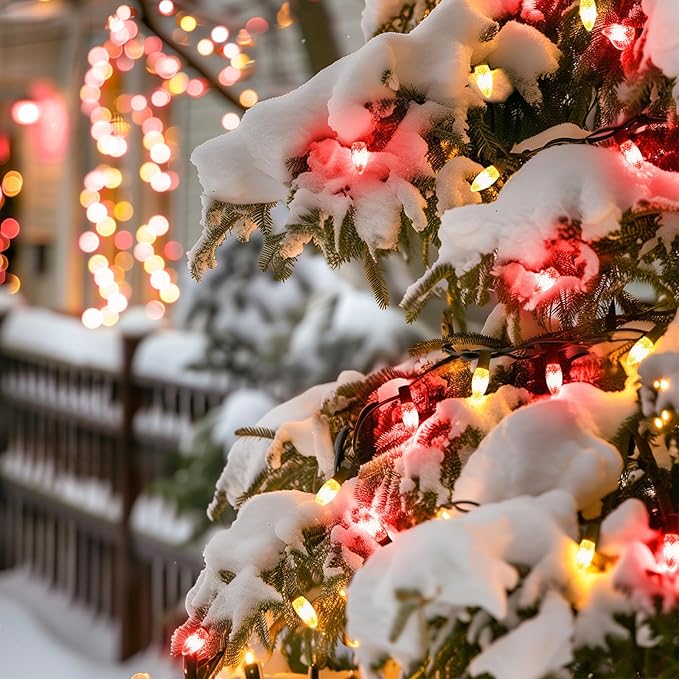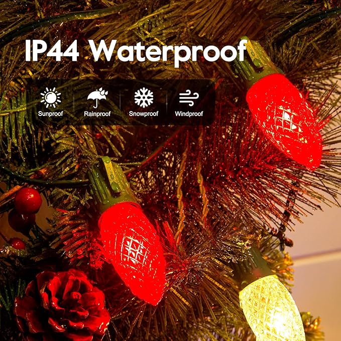 - [GREAT DECOR IAED FOR CHRISTMAS] IP44 waterproof, approved for indoor/outdoor use. Green wiring helps blend each strand into the Christmas background and allow the lights to really shine. Brighten up your home and yard with these cozy, cheerful c9 lights!