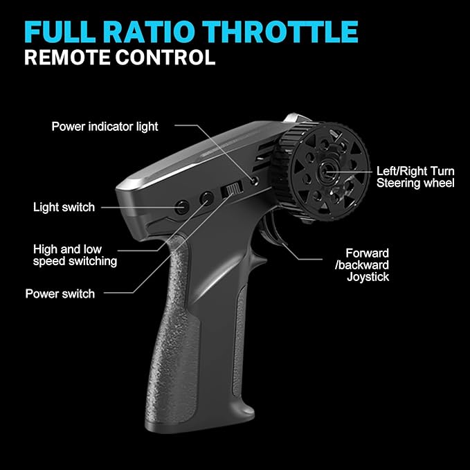 - 【4WD and Full-Scale Throttle】Has a four-wheel drive system that distributes power rationally during the form, with more torque for smoother drifting. At the same time, it has a stepless governor (full ratio throttle), which makes the acceleration more linear and real like driving.