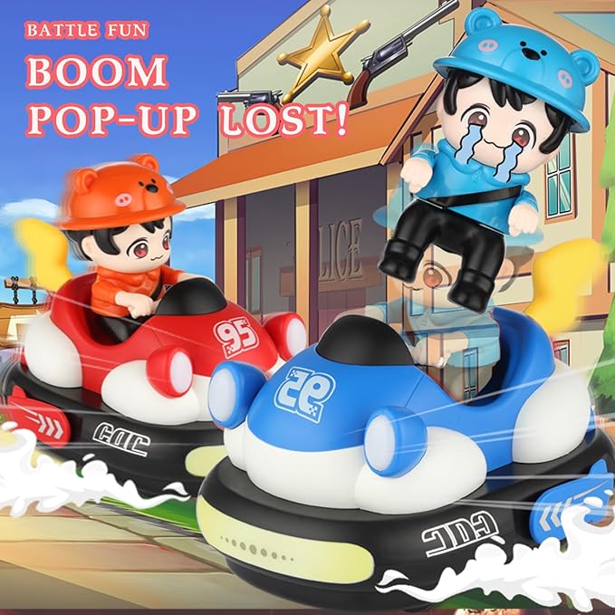 - 2-Set Premium High-Performance RC Cars: Wider build ensures stable driving, precise collisions, and easy character ejection for enhanced fun; Durable construction with improved collision and drop resistance for longevity; Powered by an 500 mAh lithium battery for up to 1 hour of play; Includes two cars in distinct colors for better identification; Features rhythm music and LED lights for engaging play day and night