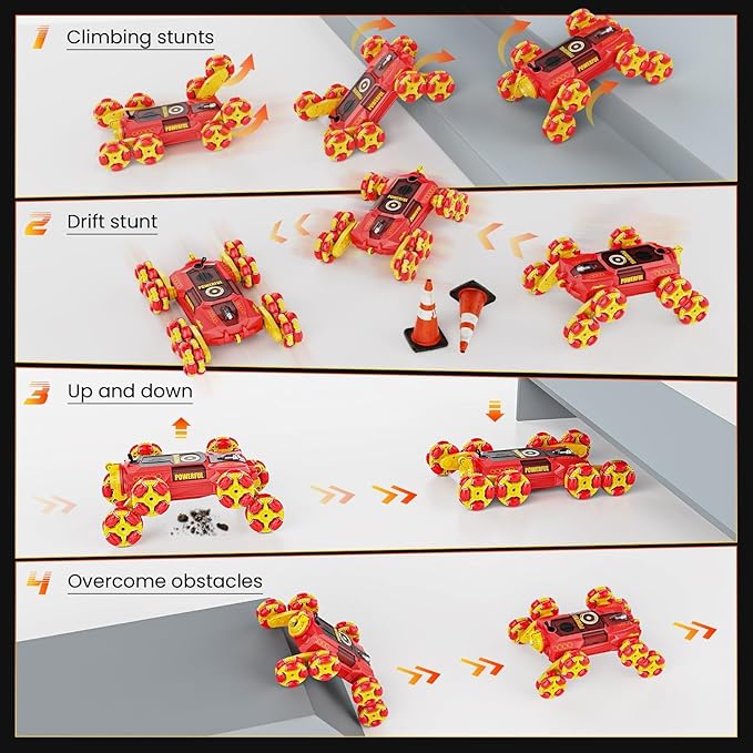 - 8 wheel stunt car: using the latest technology, the car will be flexible in front of you, you can rotate 360 degrees and complete the crawl, the video shows the function of the inside you can use, is to show off the skills of the best remote control car!