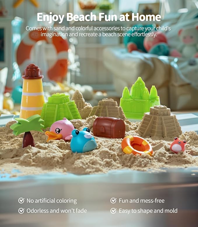 - Magic Sand Play: Comes with 2.2 lbs of kinetic sand and accessories for creative sand play. Easy to shape, clean, and store—beach fun at home