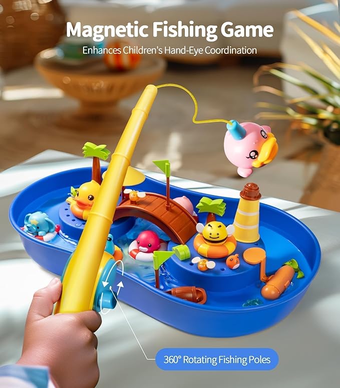 - Fishing Fun: Includes 2 magnetic fishing rods, 12 characters, and powered torpedoes for a "Lazy River" effect, enhancing hand-eye coordination and motor skills for kids 3+