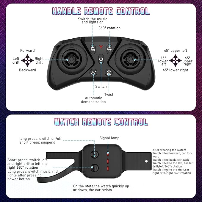 - 【2 Batteries, Hours of Fun】2 rechargeable batteries (3.7V 500mAh)*2 provide long-lasting fun. Let kids stay away from screens to play with stunt car toys with colorful lights and autopilot mode. The remote uses two "1.5V" AAA batteries (included). The gesture remote uses one "3V" button battery (included).