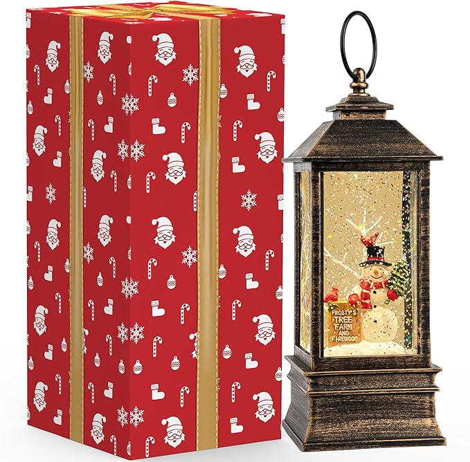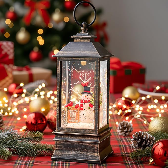 10'' Frosty's Tree Farm Snowman Musical Lighted Snow Globe Water Lantern with Swirling Glitter Decoration for Christmas Home, Living Room, Battery Operated or USB Powered