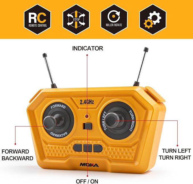 - 2.4GHZ FREQUENCY: You can control the road roller truck wirelessly from a distance, give instructions to the garbage truck through wireless signal, and command the garbage truck to make various actions. Can play with several players at the same time, the signal does not interfere with each other.