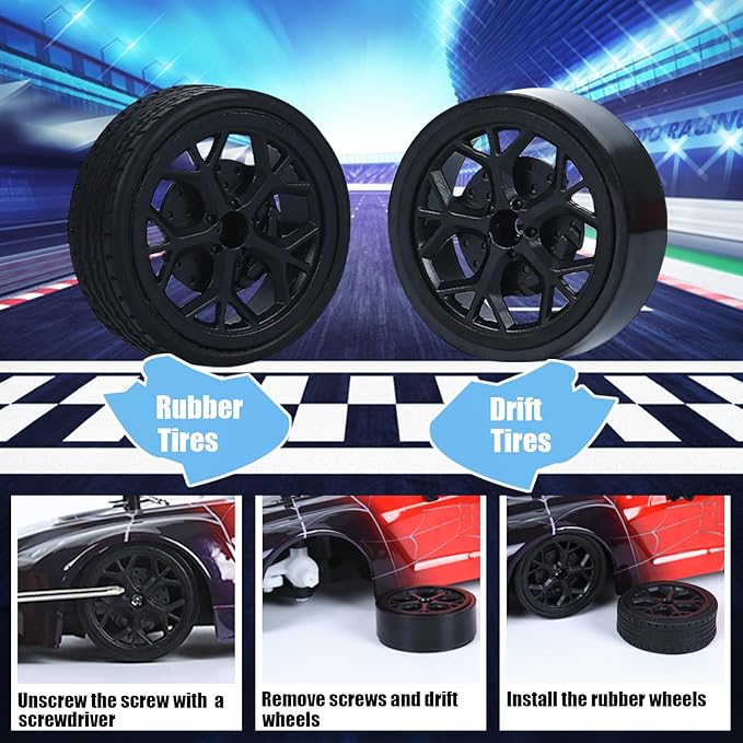 - Enjoy Racing and Drifting: The drift rc cars equipped with 4 race tires and 4 drift tires, only need one car, you can easy to dismounted and replaced the tires and experience the fun of race and drift. Kindly Note: Drift needs to be in smooth field to control the effect of drift, if not smooth field, it is recommended to use the racing tire.