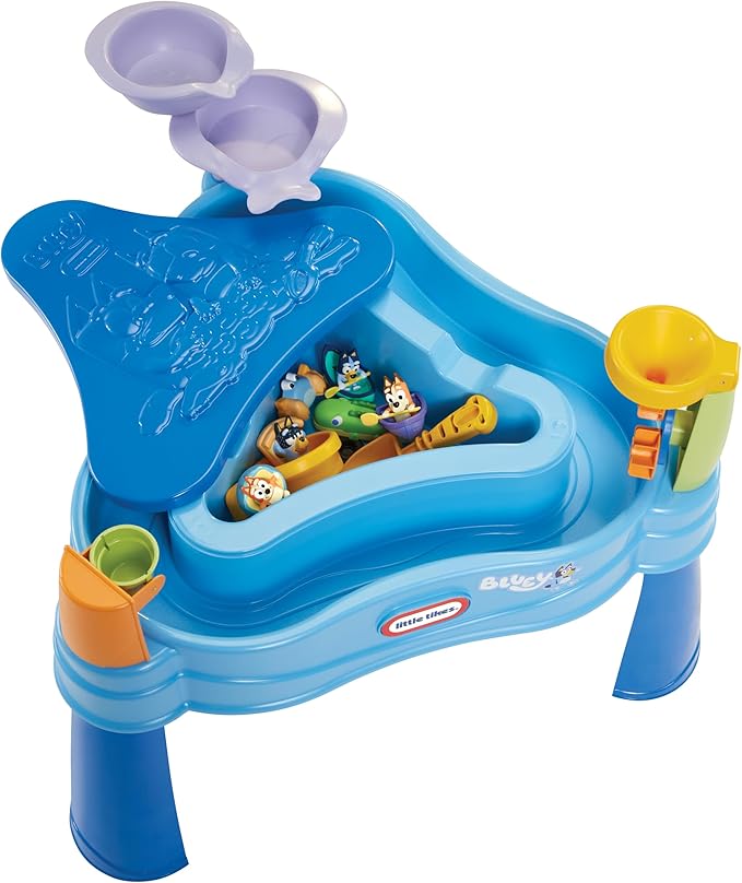 - SPLASH WITH BLUEY – This water table’s fun design encourages social and imaginative playtime where multiple kids can have fun together for hours. Its Bluey-themed accessories encourage imaginative play and a fun sensory experience with water and sand (not included).