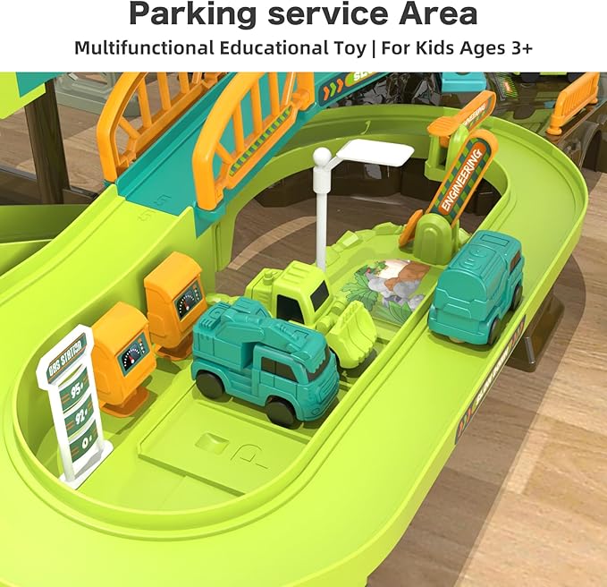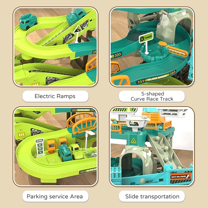 - Multi-Track Fun & Challenges: With diverse track designs including winding tunnels, sharp turns, and four obstacle paths, this set delivers hours of dynamic play. The electric climbing ladder, parking lot, and gas station enhance the play experience, helping children learn about roadways and vehicle operations.