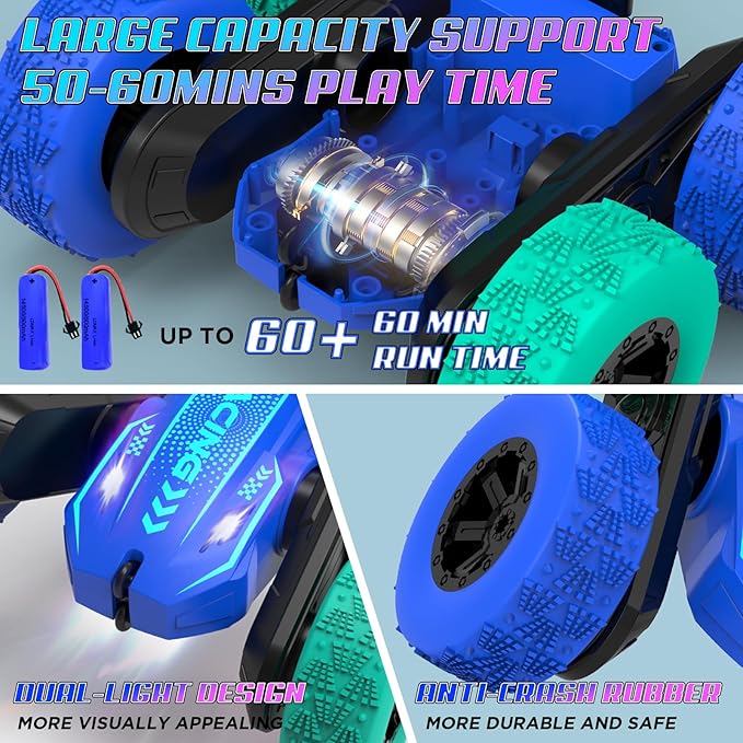 - Long-lasting Playtime: 2 rechargeable batteries for 60mins playtime, experience uninterrupted excitement with our RC car's dual 3.7V 500mAh batteries for extended long playtime and dual 1.5V AA batteries for the remote control, perfect toys for ages 5-7 8-13 boys girls kids