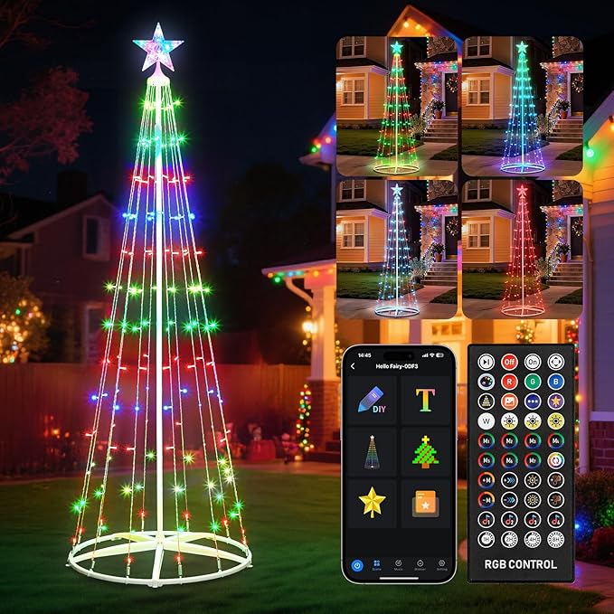 - DIY Lighting & Time Function: Led Christmas tree lights can be DIY in any pattern through the “Hello Fairy" APP. You can control individually with the app and create custom scenes to suit your needs. The color of the topper star can changed with the Christmas tree lights. This smart light-up Christmas tree has a built-in timer, You can easily set the timing to turn on or off automatically through APP or remote