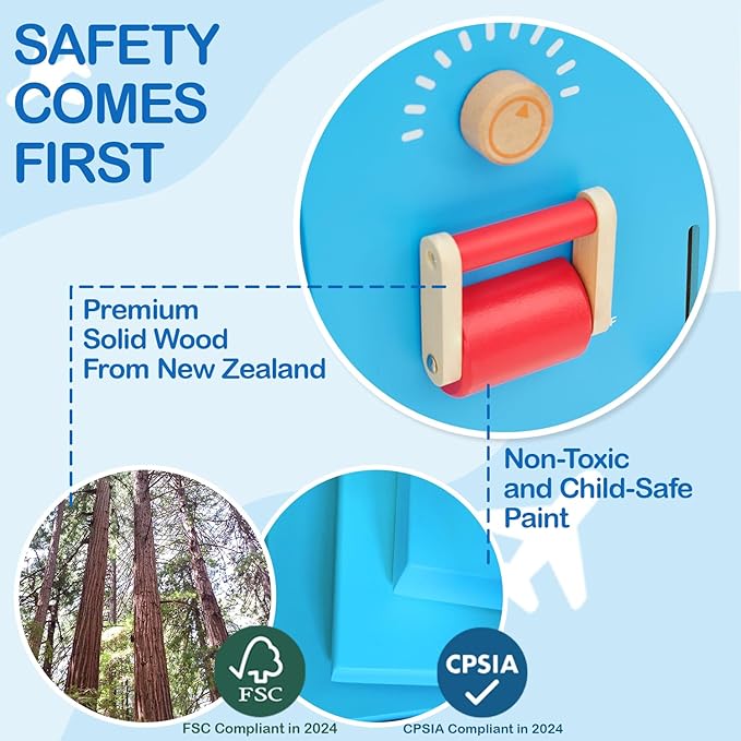 - SAFETY COMES FIRST: Crafted with the highest quality solid wood from New Zealand, our busy board has passed rigorous safety tests and received the Children's Product Certificate from a CPSC accredited laboratory, ensuring a safe play environment for little ones.