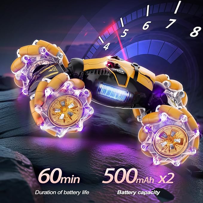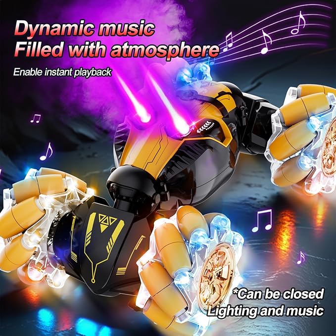 - [Double Eye Spray] The RC Stunt Car is equipped with a cool double eye spray function, which not only enhances the visual effect, but also adds fun during play. The spray effect adds a mysterious and exciting atmosphere to the toy car, as if a force of justice is surging A