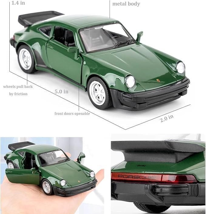 - 【Suitable Size For Playing.】The 911 model car with suitable size 1:36 scale. Dimension: L5.0" x W 2.0" x H 1.4" ; Color: Dark Green. It is easy to play everywhere and an excellent gift or collection for boys and girls.
