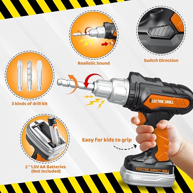 - Realistic Tool Drill Set for Kids: This toddler tool set with drill is functional and realistic.The toy electric drill comes with 3 kinds of drill bits. Press the switch to start the toy drill, you can hear buzzing sound like a real drill. There’s a button on the side to make the drill rotated left and right, and the detachable battery pack makes it even more realistic. Nice toys for toddlers age 3,4,5,6, let kids immerse in the handyman role play with the tool toys and develop imagination