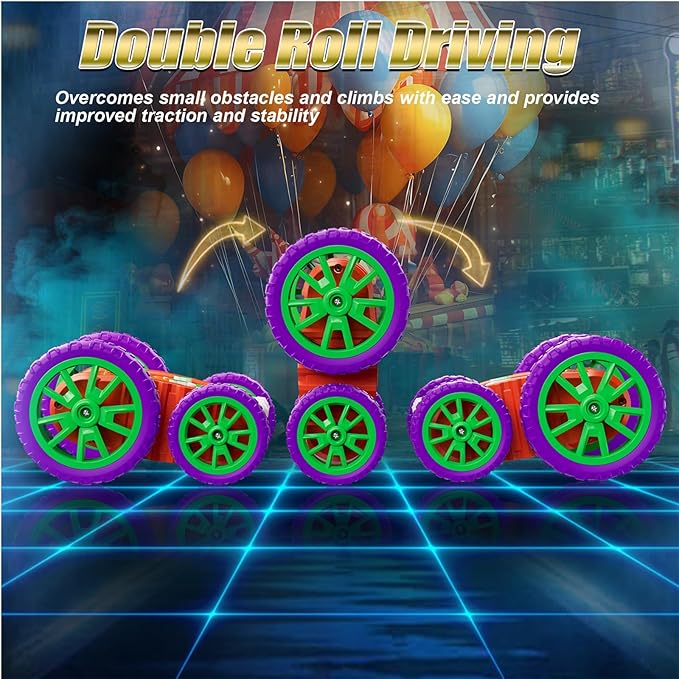 - 🚙【360° Upright Rotation & Double-Sided Driving】The newly upgraded movable bracket allows the car to stand upright and rotate 360°. The powerful dual motors provide the car with superior performance, akin to a tornado. The 4WD system enables the car to be driven on both sides, and it can continue to move forward from either side.