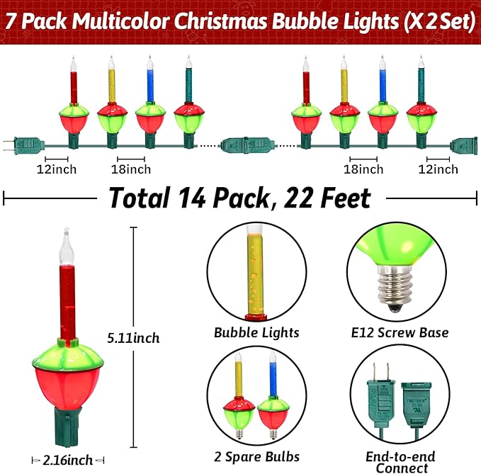 - 🌟【Christmas Bubble Light Parameter】These 2 set retor Christmas decorations lights have 14 bubble lights, and 2 replacement bubble lights bulbs, total 22 feet length. Each set 12" lead with male plug, 12" tail with female connector and 18" spacing between multicolor bubble lights. Our bubbler lights for Christmas tree fits E12 Base, 5 Watts per bulb, 35 Watts per string. Plug in bubbling Christmas lights are connectable, and can up to 12 strands for your needs