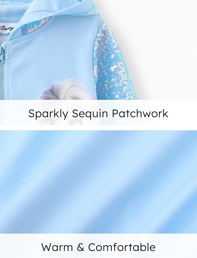 • Charming & Unique Designs:This Frozen jacket features a vibrant, oversized print of Elsa or Anna, capturing her icy charm in a fun and stylish way. The sleeves and hood are adorned with sparkling sequin accents, adding a touch of shine to cooler days. The full-zip design ensures easy on-and-off wear, while the cozy hood provides extra warmth and comfort. Perfect for layering during fall and winter, it’s a must-have for fans of Frozen outfits for girls