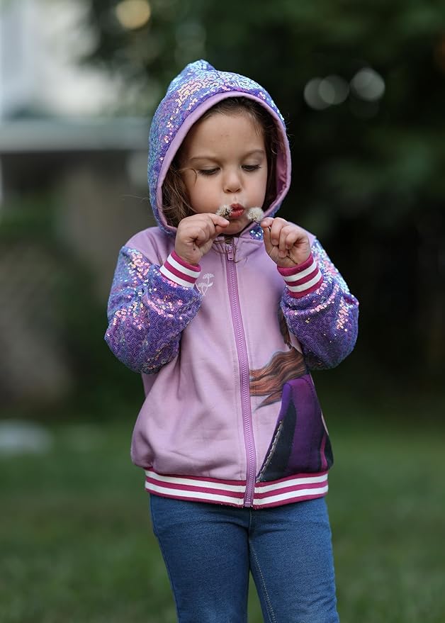 • Charming & Unique Designs:This Frozen jacket features a vibrant, oversized print of Elsa or Anna, capturing her icy charm in a fun and stylish way. The sleeves and hood are adorned with sparkling sequin accents, adding a touch of shine to cooler days. The full-zip design ensures easy on-and-off wear, while the cozy hood provides extra warmth and comfort. Perfect for layering during fall and winter, it’s a must-have for fans of Frozen outfits for girls