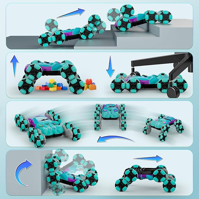 - 2024 Innovative 8-wheel Stunt Car: 2024 Brand-new upgrade and innovation. Not only move forward, backward, turn left and right, but also rotate 360° on the spot, circle left and right, drift, crawl and drive on both sides. Each pair of tire arms can be operated separately and can rotate in different directions to raise the body to avoid obstacles. Especially suitable for boys and girls aged 6-12 years old and above.