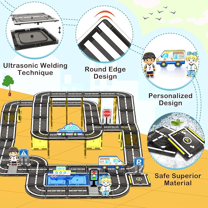 - STEM Sensory Toys : IGIVI Montessori magnetic tiles city set is designed with STEM, Road elements were added to the original design, such as straight roads, curved roads and traffic sign that kids can easily connect to create various road layouts. And these bright colors blocks kids not only can Improve kid's range of color cognition but also build 2D flat shapes even 3D geometric shapes. Kids can learn about basic traffic rules and promote creative thinking during the course of building their own city worlds out of their imagination.