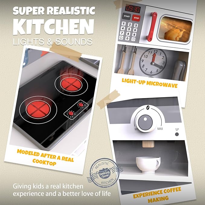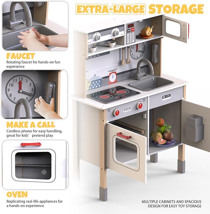 - All Set for Fun: This latest smart kids play kitchen features sound and light effects, complete with an oven, an ice maker that drops ice into cups, a stove with sound and light, a wall-mounted phone, a coffee maker, a sink, and cabinets. This uniquely designed wooden play kitchen set makes a perfect gift for kids' birthdays and Christmas. It's a popular choice for kids kitchenâboth stylish and fun!